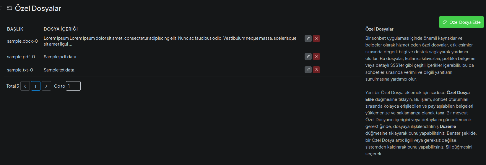 PDF, CSV, DOCX, PPT gibi farklı türlerdeki belgelerinizi yükleyerek BilgeBot’un öğrenme havuzunu dilediğiniz kadar genişletebilirsiniz.
