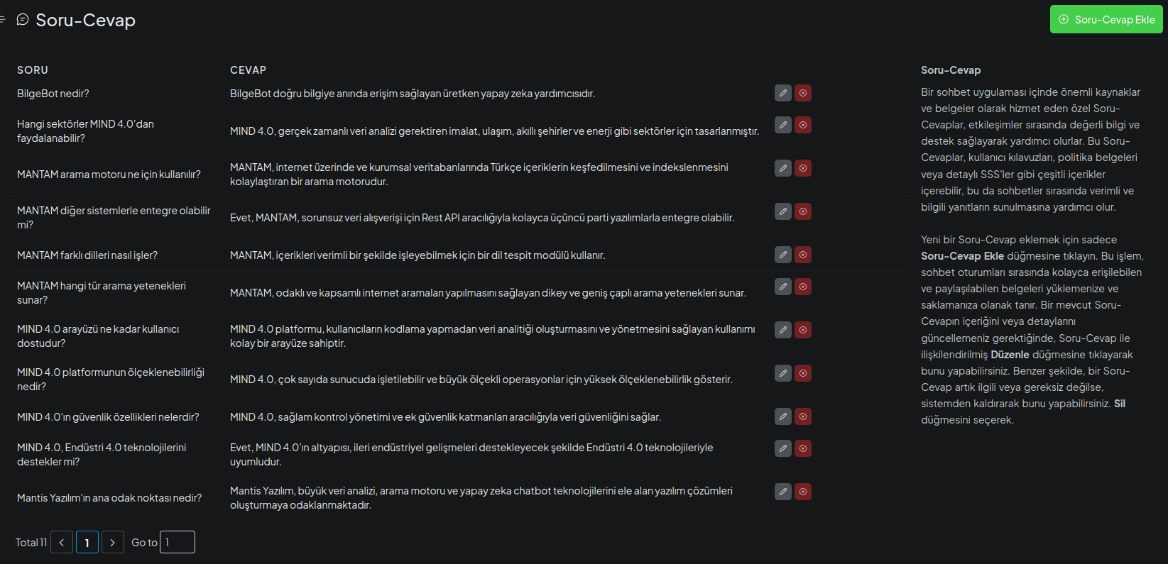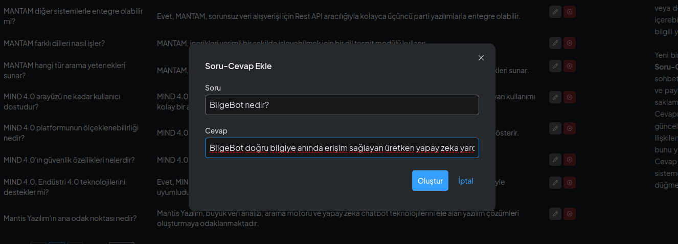 Kendi soru ve cevaplarınızı oluşturarak, sık sorulan sorulara BilgeBot’un yanıt vermesini sağlayabilirsiniz.