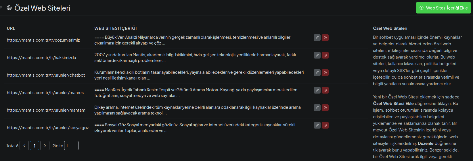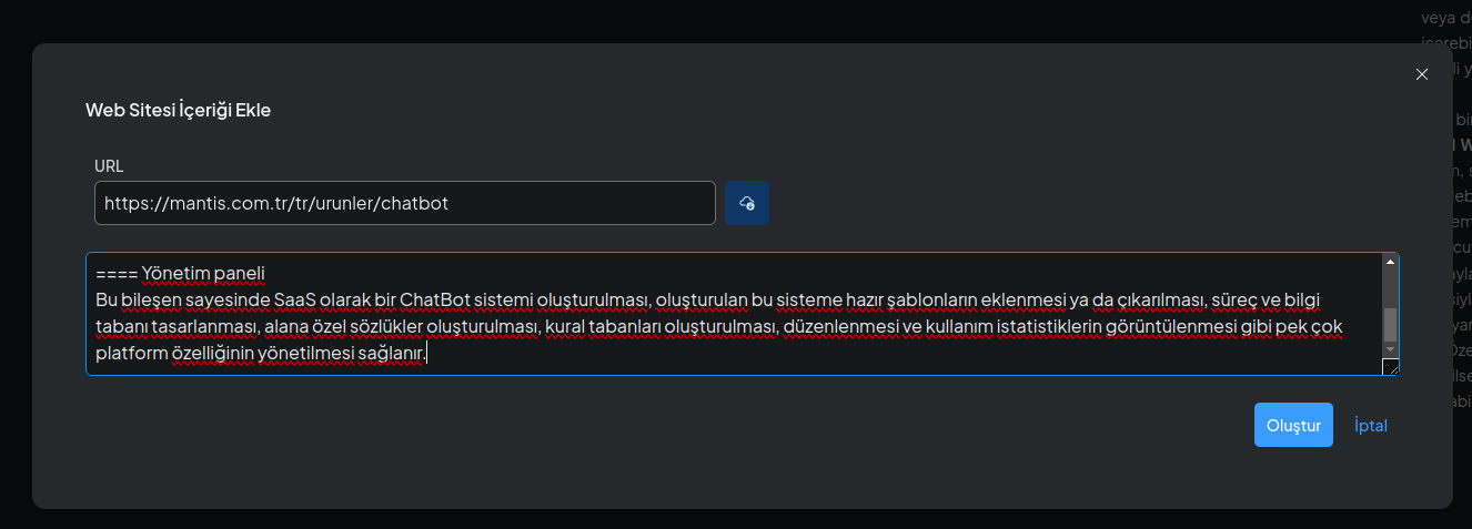 Kurumsal web sayfalarınızı ekleyerek BilgeBot’un bu sayfalardaki içerikleri öğrenmesini sağlayabilirsiniz.